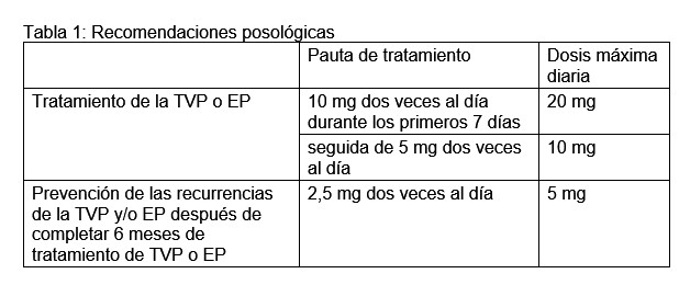 Prevención del ictus y de la embolia sistémica en pacientes adultos con fibrilación auricular no-valvular (FANV). La dosis recomendada de apixabán es de 5 mg administrados dos veces al día por vía oral. Reducción de dosis: La dosis recomendada de apixabán es 2,5 mg administrados dos veces al día para pacientes con FANV y al menos dos de las siguientes características: edad ≥ 80 años, peso corporal ≤ 60 kg, o creatinina sérica ≥ 1,5 mg/dl (133 micromoles/l). El tratamiento debe continuarse a largo plazo. Tratamiento de la TVP, tratamiento de la EP y prevención de las recurrencias de la TVP y de la EP en adultos. La dosis recomendada de apixabán para el tratamiento de la TVP aguda y el tratamiento de la EP es de 10 mg dos veces al día por vía oral, durante los primeros 7 días, seguida de 5 mg dos veces al día por vía oral. De acuerdo con las guías médicas disponibles, la duración corta del tratamiento (como mínimo de 3 meses) se debe basar en factores de riesgo transitorios (p. ej., cirugía reciente, traumatismo, inmovilización). La dosis recomendada de apixabán para la prevención de las recurrencias de la TVP y de la EP es de 2,5 mg dos veces al día por vía oral. Cuando esté indicada la prevención de las recurrencias de la TVP y de la EP, se debe iniciar con 2,5 mg dos veces al día después de completar 6 meses de tratamiento con apixabán 5 mg dos veces al día o con otro anticoagulante, tal como se indica en la Tabla 1 a continuación