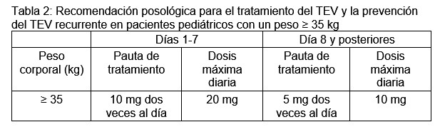 La duración del tratamiento global se debe individualizar después de una evaluación minuciosa del beneficio del tratamiento frente al riesgo de hemorragia. Tratamiento del TEV y prevención del TEV recurrente en pacientes pediátricos. El tratamiento con apixabán para pacientes pediátricos de 28 días hasta menos de 18 años de edad se debe iniciar después de al menos 5 días de tratamiento anticoagulante parenteral inicial. El tratamiento con apixabán en pacientes pediátricos se basa en una pauta posológica por niveles de peso corporal. La dosis recomendada de apixabán en pacientes pediátricos con un peso ≥ 35 kg se muestra en la Tabla 2.