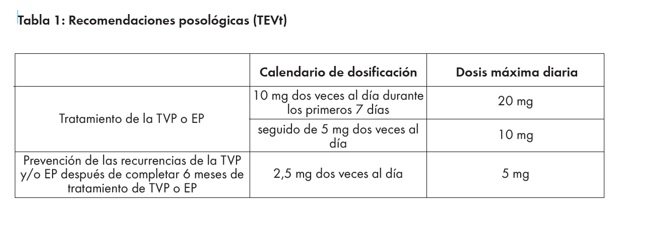 Prevención del TEV en cirugía electiva de reemplazo de cadera o rodilla. La dosis recomendada de apixabán es de 2,5 mg administrados dos veces al día por vía oral. La dosis inicial debe tomarse entre 12 y 24 horas después de la intervenciónquirúrgica. Para decidir el momento de administración en esta ventana de tiempo, los médicos deben considerar tanto los beneficios potenciales de un inicio temprano en el tratamientopara la profilaxis del TEV como el riesgo de sangrado posquirúrgico. En pacientes sometidos a cirugía de reemplazo de cadera. La duración recomendada del tratamiento es de 32 a 38 días. En pacientes sometidos a cirugía de reemplazo de rodilla. La duración recomendada del tratamiento es de 10 a 14 días. Prevención del ictus y de la embolia sistémica en pacientes con fibrilación auricular no-valvular (FANV). La dosis recomendada de apixabán es de 5 mg administrados dos veces al día por vía oral. Reducción de dosis. La dosis recomendada de apixabán es 2,5 mg administrados dos veces al día para pacientes con FANV y al menos dos de las siguientes características: edad ≥80 años,peso corporal ≤60 kg, o creatinina sérica ≥1,5 mg/dL (133 mmoles/L). El tratamiento debe continuarse a largo plazo. Tratamiento de la TVP, tratamiento de la EP y prevención de las recurrencias de la TVP y de la EP. La dosis recomendada de apixabán para el tratamiento de la TVP aguda y el tratamiento de la EP es de 10 mg dos veces al día por vía oral, durante los primeros 7 días,seguida de 5 mg dos veces al día por vía oral. De acuerdo con las guías médicas disponibles, la duración corta del tratamiento (como mínimo de 3 meses) debe basarseen factores de riesgo transitorios (por ejemplo, cirugía reciente, traumatismo, inmovilización). La dosis recomendada de apixabán para la prevención de las recurrencias de la TVP y de la EP es de 2,5 mg dos veces al día por vía oral. Cuando esté indicada la prevención de las recurrencias de la TVP y de la EP, se debe iniciar con 2,5 mg dos veces al día después de completar 6 meses de tratamiento con apixabán 5 mg dos veces al día o con otro anticoagulante, como se indica en la Tabla 1 más abajo.