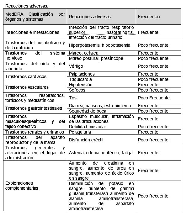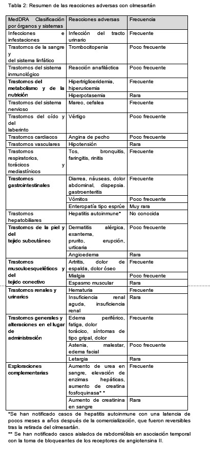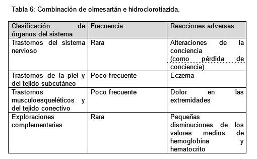 Otras reacciones adversas notificadas en los ensayos clínicos o a partir de la experiencia posterior a la comercialización con una combinación a dosis fija de olmesartán e hidroclorotiazida y no notificadas para olmesartán - amlodipino - hidroclorotiazida, olmesartán en monoterapia o hidroclorotiazida en monoterapia o notificadas con mayor frecuencia con la combinación doble (Tabla 6):