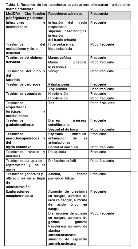 En las Tablas 1,2,3 y 4 se resumen las reacciones adversas procedentes de los ensayos clínicos publicados, de los estudios de seguridad posteriores a la autorización y de las notificaciones espontaneas para la combinación de olmesartán - amlodipino - hidroclorotiazida, así como para los componentes individuales olmesartán medoxomilo, amlodipino e hidroclorotiazida, en base al perfil de seguridad conocido de los componentes individuales. Las reacciones adversas notificadas más frecuentemente durante el tratamiento con olmesartán - amlodipino - hidroclorotiazida son edema periférico, cefalea y mareo. Se ha utilizado la terminología siguiente para clasificar la aparición de las reacciones adversas: Muy frecuentes (≥1/10) Frecuentes (≥1/100 a < 1/10) Poco frecuentes (≥1/1.000 a < 1/100) Raras (≥1/10.000 a < 1/1.000) Muy raras ( < 1/10.000) Frecuencia no conocida (no puede estimarse a partir de los datos disponibles).