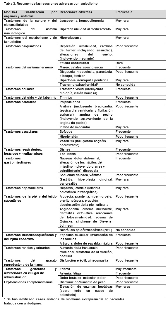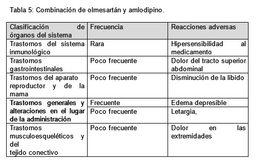 Otras reacciones adversas notificadas en los ensayos clínicos o a partir de la experiencia posterior a la comercialización con una combinación a dosis fija de olmesartán y amlodipino y no notificadas para olmesartán - amlodipino - hidroclorotiazida, olmesartán en monoterapia o amlodipino en monoterapia o notificadas con mayor frecuencia con la combinación doble (Tabla 5):